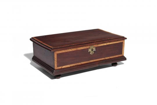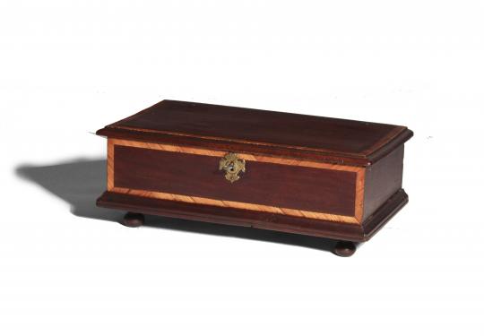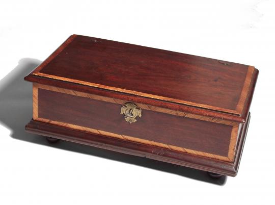 The bible box has its original hinges, ball feet and escutcheon. Inlay on the top has been enhanced.
