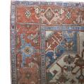 The center has a bronze floral patterned polychrome poled medallion inside a salmon stylized diamond medallion which is cross-thatched with blue vines intersecting floral creme colored buds. A rectangular creme colored field with with blue and salmon colored corners provide the background field which is surrounded by a blue and salmon polychrome floral border.