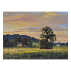 The perfect 18th Century farmstead view through a hedgerow on the crest at the hill. This conveys peace and continuance in a cozy little valley far from the sprawl.