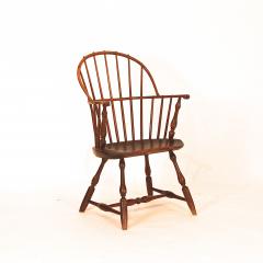 Although many of the elements of this armchair are typical of Philadelphia windsors, this one stands alone. Nicely carved ears flank the crest rail which connects to hickory spindles binding into a walnut riser joining two nicely shaped arms supported by elegant serpentine supports. The walnut D-seat sits over boldly turned legs joined by an H-stretcher with vase and ring turnings...