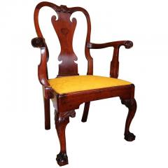 This armchair combines the elegance of the Queen Anne period with an exceptional old finish. It has a boldly carved shell in the center of a cupid's bow crest with a solid splat, nicely carved knuckle arms, a scalloped apron and cabriole legs terminating in trifid feet.