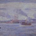 Engaging harbor scene in reproduction gold frame by a leading Philadelphia painter and teacher.