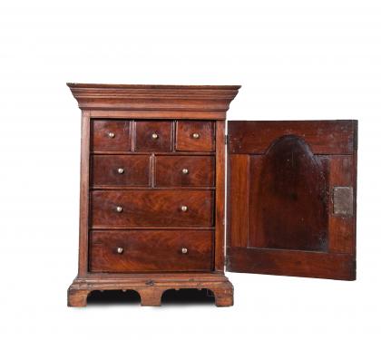 We are known for our knowledge of the spice box form. For years, we have had the privilege of representing some of the finest examples known in the market. This exciting chest has a prominent cornice over a tombstone door concealing a three-over-two-over-two drawer arrangement interior with figured wood. The base has a center drop acting as a center foot with 4 flanking subtle spurs and bracket feet. This particular book is pictured in The Pennsylvania Spice Box, Paneled Doors and Secret Drawers by Lee Ellen Griffith, plate 19, p. 71.