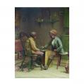 Known for his detailed and insightful figurative works, this highly desirable painting of two boys playing checkers is characteristic of his best works. In the lower right, the painting is signed, dated and titled on verso. In addition it has exhibition labels.