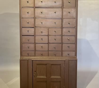 Small drawers above a paneled door. Historic reddish-brown paint over a blue green paint. Base molding restored. Knobs restored. Signed W. Ziegler